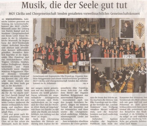 Der MGV „Cäcilia“ Bösensell unter Leitung von Patrick Kampf und die Sendener Chorgemeinschaft unter Leitung von Klaus Homann konnten am 4.12.2011 in der Pfarrkirche St. Johannes Bösensell ein adventliches Konzert ausrichten. Dabei war auch das Streichorchester der Musikstudenten aus Münster, die Sopranistin Elke Frandrup und Mathias Brüggemann an der Orgel.